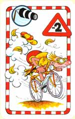 Gegenwindkarte: Zieht ein Spieler eine solche Karte, so muss er sie sofort vor sich auslegen. Diese Runde wird seine Geschwindigkeit um 2 km/h vermindert.