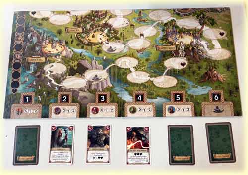 Der Grund dafür ist, dass von den sechs ausliegenden Karten fünf Bedrohungen sind und 2 gute Effekte haben. Das gilt übrigens für jede Etappe, immer scheidet eine der sieben Karten zufällig aus dem Spiel aus. Diese werden neben die Felder mit der schwarzen Zahl am Spielplan gelegt.