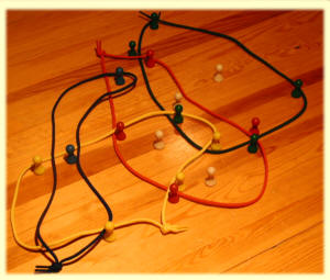 Das Material ist einfach und ungewöhnlich zugleich. Pöppel in fünf Farben repräsentieren die Dämonen und Geister, vier dicke, farbige Schnürsenkel die Kraftlinien. Die Schnürsenkel sind jeweils zu einem Kreis geknotet und bilden, beliebig über- und nebeneinander gelegt, das immer andersartige Spielfeld. Das alles ist funktionell, schön anzusehen, aber halt doch abstrakt - die Geschichte mit den Dämonen und Geistern passt zwar gut, hat aber mit dem Spiel ansonsten nichts zu tun.