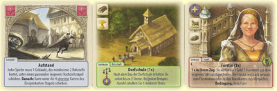 Zufriedenheitspunkte in Form von Sternen stellen die neue Ressource in diesem Themenset dar. Zum Zählen dieser Punkte dient die Zählkarte, die man kostenlos auslegen darf, wenn man sie zieht. Sterne erhält man durch Stadtausbauten. Man benötigt sie für die Errichtung besonderer Bauten. Hart ist in diesem Themenset die Ereigniskarte "Aufstand", die von jedem Spieler ein Gebäude zerstört, das mindestens zwei Rohstoffe wert ist. Nach jedem Einsatz wird sie gleich wieder an vierter Stelle des Nachziehstapels platziert, so dass sie recht schnell wieder kommt.