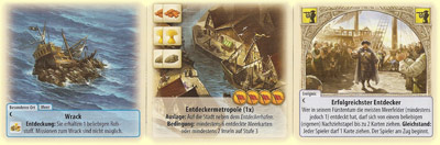 Hier gibt es schon beim Start eine Veränderung. Jeder Spieler legt seine neun Meerkarten verdeckt als 3 x 3 Raster aus. Daneben platziert man den dazugehörigen Entdeckerhafen, der durch eine Straße mit der eigenen Siedlung verbunden wird. Im Hafen darf man Schiffe bauen, mit denen man die einzelnen Meereskarten erkunden kann. Zu finden gibt es dort Inseln, die unter bestimmten Voraussetzungen unterschiedliche Erträge (auch Siegpunkte) bringen, Wracks, die einmalig eine beliebige Ressource erbringen, oder aber Piraten, die man mit seinen Schiffen und Kanonenpunkten bekämpfen muss. Verbessern kann man seine Flotte übrigens durch Karten aus dem dazugehörigen Themenset.