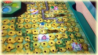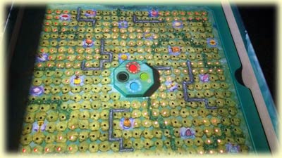 Der Spannungsbogen: Der steht und fällt mit der Bedrohung der Monster, denn das ist das Hauptziel dieses Spieles: Die Monster aufzuhalten, bevor sie die Burg erreichen. Aber wenn sich die Monster nicht rühren, weil sie wenig bis gar nicht gewürfelt werden, gibt's auch keine Bedrohung, und was bleibt, sind blinkende Lichter. Die faszinieren die Kinder für eine Partie, vielleicht auch zwei, aber nach einer dritten Partie ohne wirkliche Gefahr boykottierten die Kinder das Spiel. Optimal wäre, wenn die Monsterbewegung auch durch andere Sachen ausgelöst würde als nur durch den Würfel. Vielleicht die bösen Irrlichter. Dann müsste man sich deren Position wirklich merken. Aber so bleibt der Merkaspekt deutlich hinter dem, was das Spiel können könnte.