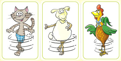 Zwei Karten werden in die Tischmitte gelegt. Wer an der Reihe ist, deckt vom verdeckten Stapel zwei weitere auf. Liegen nun mindestens drei gleiche Tiere aus oder drei, die dieselbe Bewegung machen, muss man schnellstmöglich reagieren: Sind es gleiche Tiere, muss man den entsprechenden Tierlaut nachmachen (es gibt Hund, Katze, Hahn, Schaf, Frosch und Schwein), andernfalls die Bewegung. Hier stehen auf einem Bein hüpfen, eine Drehung, Hände über den Kopf nehmen und klatschen, mit den Händen eine Brille vor den Augen machen und sich wie ein Affe lausen zur Option. Wer am schnellsten das Richtige gemacht hat, darf sich alle Karten nehmen, die zu seiner Lösung gehören, also drei oder sogar mehr.