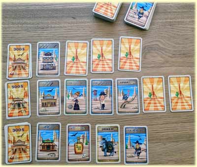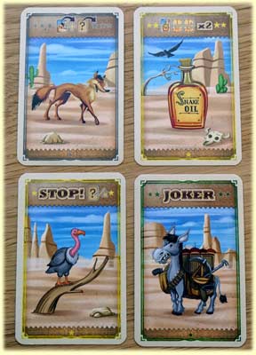 Doch Vorsicht, in der Reihe können auch Sonderkarten abgelegt worden sein, die verschiedene Effekte haben und deinen Raubzug entweder behindern oder begünstigen. Der Jolly Joker ersetzt einen beliebigen Ausrüstungsgegenstand; das Schlangen-Elixier wirkt verdoppelnd auf alle nachfolgenden Banditenkarten; der Kojote schnappt sich die nachfolgende Karte und beide wandern auf den Ablagestapel und der Geier stoppt das Ausrauben, d.h. es können in diesem Zug keine weiteren Karten aufgedeckt werden.