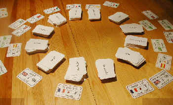 28.07.09 von Elmar Dünßer - Im Unterschied zu Memory spielen hier die Spieler direkt gegeneinander, indem einer dem anderen auch bereits angeeignete Kartengruppen wieder wegnehmen kann, was besonders bei Kindern sehr gut ankommt. Gute Spielidee, aber leider unbrauchbar in der momentanen Ausführung, denn beim Vorlesen von Wörtern in unbekannten Sprachen ist man auf die vorhandene Umschrift angewiesen - diese ist jedoch miserabel, z.B. "grar" für frz. grand, "la motre" für frz. la montre und "jhöhh" (!) für frz. je. Obendrein ist die gewählte Schriftart lesehemmend. Sehr bedauerlich! |