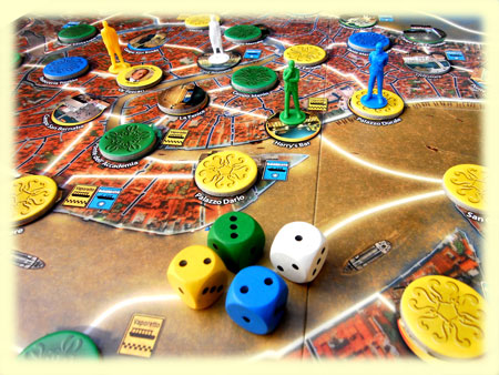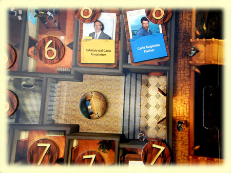Und diese Ermittlungskarten können sehr angenehme Effekte haben. Einige erlauben die Benutzung des "Vaporetto" oder des Polizeibootes, zwei venezianische Verkehrsmittel, die es ermöglichen, eine Figur - sogar ohne Verbrauch von Bewegungspunkten! - von einer entsprechenden Haltestelle zu einer anderen zu bewegen. Die Entfernung spielt dabei keine Rolle, der Zielort der Bewegung kann sich also durchaus am anderen Ende der Stadt befinden. MIt einer "Vorladung" kann auch eine farbfremde Person befragt oder festgenommen werden. Mit einem "Treffen" wiederum kann man eine Spielfigur unverzüglich (auch quer durch die Stadt) zu einer anderen Spielfigur ziehen. Außerdem gibt es für jede Spielfigur noch eine spezielle Ermittlungskarte; so kann zum Beispiel Vianello mit der Karte "Tauschhandel" beliebig viele Ermittlungskarten aus seiner Hand gegen neue vom Stapel tauschen. Selbst mit wenigen Bewegungspunkten lassen sich durch die Ermittlungskarten gefinkelte, manchmal überraschende Spielzüge durchführen. Es kann sich deshalb durchaus lohnen, einen Würfel mit weniger Würfelaugen zu wählen, um Ermittlungskarten zu erhalten.
