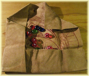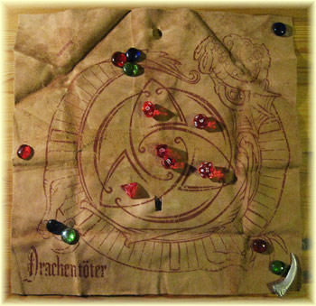 Das Herausragende an diesem Spiel ist in jedem Fall das wunderschöne Material: Der Spielplan besteht aus echtem Leder und ist in thematisch passender, mittelalterlich anmutender Art gestaltet. Zum Transport werden die gläsernen Spielsteine und transparenten Würfel einfach in den Spielplan eingewickelt, der auf raffinierte Art gefaltet und mit einem ansehnlich gestalteten Drachenzahn aus Zinn zusammen gehalten wird.
