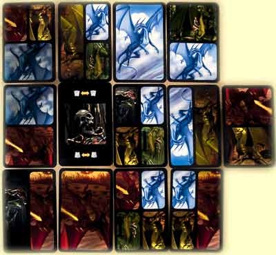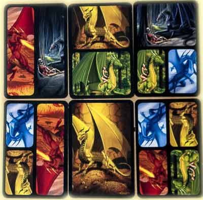 Die 51 Drachenkarten sind in bis zu vier Rechtecke unterteilt. Diese Rechtecke sind mit den fünf im Spiel vorhandenen Drachenfarben eingefärbt.