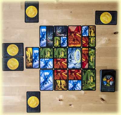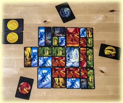 Wir nehmen ... Drachen. Wenn die Drachen nicht so schön wären (und aus dem Pinsel des bekannten Dungeons & Dragons Illustratoren Larry Elmore stammten), dann würde das aufgesetzte Thema stärker auffallen. Durch die hochwertigen Illustrationen schauen wir aber gerne darüber hinweg und wenden uns dem Spielziel zu. Zu Beginn des Spiels erhält jeder Spieler verdeckt eine Farbe zugewiesen, die sich auf den Spielkarten wiederfinden. Jede Karte weist dabei bis zu vier unterschiedliche Farbquadrate in den Spielerfarben auf. Den Sieg trägt jener Spieler davon, der es schafft, eine verbundene Fläche in seiner Farbe zu bilden, die sich über sieben Karten erstreckt. Da sich die ausgelosten Farben im Verlauf des Spieles ändern, gibt es einige Hindernisse, bis dieses Ziel erreicht werden kann.