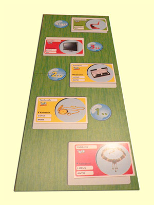 Auktionen sind modern, sowohl im Internet als auch bei Spielen. Deshalb liegt die Idee nahe, Internetauktionen spielerisch zu verabeiten. Leider funktioniert das nicht. Der unwürdige Schreiber dieser Zeilen versuchte sich selbst mal an dieser Aufgabe und scheiterte kläglich. Nun versuchte der Autor von 3..2..1 immerhin das Auktionsverfahren kurz und einfach zu gestalten. Man bietet verdeckt und gleichzeitig. Der Meistbietende bekommt eine Ware. Alle andere zahlen eine Gebühr in Form ihres größten gebotenen Geldscheins. Es gibt keinen Geldnachschub und wer zuerst drei gleichartige Stücke ersteigert hat, gewinnt. Alle anderen gratulieren und fragen sich: Wieso bezahle ich im Internet mit Bargeld? Wieso gibt es kein Wechselgeld? Warum zahlen unterlegenen Bieter Gebühren? Wieso verschwenden wir unsere Zeit mit diesem Spiel? Ähnliches muss sich wohl eBay gefragt haben. Ich kann mir einige Gründe vorstellen, warum dieses eBay-Spiel nicht "eBay, das Spiel" heißt. Würde aber eBay wie das eBay-Spiel funktionieren, so wäre eBay schon längst beim Konkursverwalter unter den Hammer gekommen.