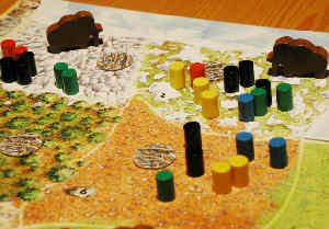 Es folgt die Konfliktwertung: In jedem der maximal zwölf Gebiete dürfen sich nur drei Jäger aufhalten. Die Feuerstellen, die erst jetzt aufgedeckt werden, erlauben je nach Aufdruck 0-2 weitere Jäger im jeweiligen Gebiet, und für jeden Mammut darf ein weiterer Jäger im betreffenden Gebiet verweilen. Wird das solchermaßen errechnete Kontingent eines Gebietes überschritten, muss der zahlenmäßig am schwächsten vertretene Spieler einen seiner Jäger entfernen; es folgt der Spieler mit den zweitwenigsten Jägern usw. – so lange, bis die Kapazität des Gebietes erreicht oder gar unterschritten ist. Bei dieser „Auslese“ bleiben Jäger, die mit einer Keule ausgestattet wurden, stets unangetastet.