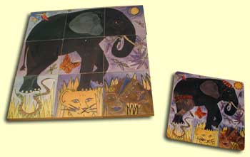 Hier handelt es sich einfach um ein Puzzlespiel. Ein Ziel, das man dabei eventuell vorgeben könnte, ist das Bauen eines Elefanten, der nur aus indischen bzw. afrikanischen Elefanten-Bauteilen besteht. Da die Holzplättchen alle beidseitig bedruckt sind, nämlich auf einer Seite mit indischen und auf der anderen mit afrikanischen Elefantenteilen, geht die Puzzle-Rechnung immer auf, selbst wenn man 36 Holzplättchen gezielt für rein afrikanische bzw. indische Elefanten benutzen möchte.