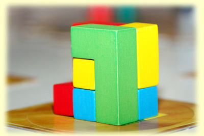 Das Bruchstückrätsel ist bei uns besser bekannt unter dem Namen "Tangram", ein uralteschinesisches Legespiel (8. bis 4. Jahrhundert v. Chr.), bei dem aus den stets gleichen sieben Teilen verschiedene Muster gelegt werden müssen. Es erfordert optische Intelligenz, um Formen richtig zerlegen und zusammensetzen zu können. In dieselbe Richtung geht das Winkelsteinrätsel, bei dem - ähnlich dem Ubongo 3D - räumliche Vorstellungskraft vonnöten ist. Dass es dabei um die Ansicht aus der Vogelperspektive geht, ist eine interessante und zum Teil recht fordernde Abwandlung.