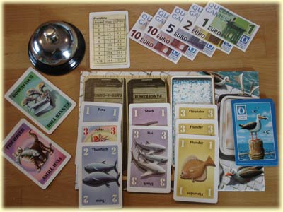 Spieler D: „Heeeeute friiiisch im Angebot, für zehn Euro: Drei Aale. Niemand schlägt zu? Dann lege ich noch zwei Sharkies drauf! Für zehn Euro! Und jetzt noch zwei Flundis......" – pling! Verkauft an Spielerin C: Drei Karten wechseln den Besitzer und bringen dem Versteigerer drei Euro als Provision ein. Der Festpreis von zehn Euro kommt in die Bank.