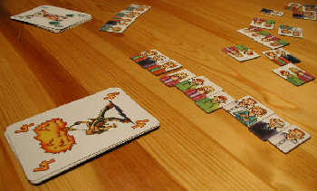In die Mitte des Tisches werden die Zuschauerplättchen gelegt. Von den 55 Karten, die Feuerschlucker, Gewichtheber, Wahrsagerinnen und andere Artisten zeigen, erhält jeder Spieler 5 verdeckt auf die Hand. Die restlichen Karten bilden den Nachziehstapel. Der Startspieler spielt eine seiner Karten aus, d. h. er legt sie offen vor sich auf den Tisch und ergänzt seine Handkarten wieder auf 5. Wenn er das nächste Mal an der Reihe ist, legt er auf die in der letzten Runde ausgespielte Karte eine neue Karte, so dass immer nur die oberste Karte zu sehen ist. Dabei gibt es nun neben den normalen Künstlern (= Zahlenkarten) auch einige Sonderkarten (Zuckerwatten-Lotte, menschliche Pyramide, Löwe Leo und Clowns).