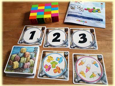 Bei Flotter Otter erhält jeder Mitspieler 5 stapelbare verschiedenfarbige Kisten. Mittig werden drei sogenannte Abgreifkarten mit den Ziffern 1 bis 3 sowie der Frachtbriefstapel, von dem jeder eine verdeckte Karte erhält, platziert, und schon kann das Spiel beginnen.
