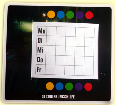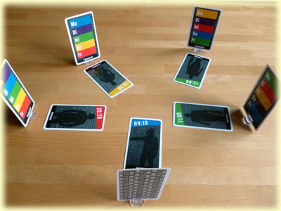 Anschließend gibt es noch für jeden Spieler ein Blatt vom Decodierungsblock sowie 12 Informantenkarten. Diese Karten zeigen eine der fünf Hintergrundfarben sowie eine Uhrzeit, wobei diese beiden Infos bei allen Karten unterschiedlich sind. Die Informantenkarten werden so verteilt, dass jeder Spieler von jeder Farbe mindestens zwei erhält.