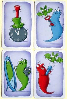 Dies sind jedoch noch nicht alle Regeln. Sind nämlich auf einer Karte sowohl die Uhr als auch das Gespenst zu sehen, darf überhaupt nichts gemacht werden, das heißt, alle sollten ihre Hände bei sich behalten. Stattdessen muss man als Erster die von der Uhr angezeigte Zeit ausrufen.