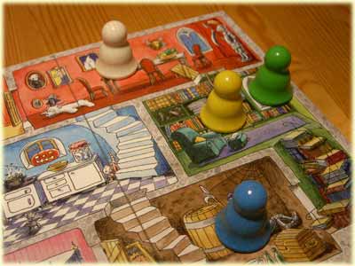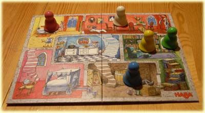 Womit wir bei der Altersangabe sind, die mit 4 bis 8 Jahren festgesetzt ist. Die 6- und 7-Jährigen in meinen Testrunden spielten Gespenstisch! nur deshalb fertig, weil ein Ende des Spiels doch recht schnell naht (nach etwa 10 Minuten ist der Spuk vorbei), fanden es aber allesamt langweilig. Die Jüngeren konnte man eher für das Spiel begeistern, die unter 4-Jährigen verstanden allerdings das Prinzip, dass die Gespenster nicht in angrenzende Zimmer dürfen, noch nicht richtig.