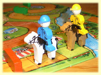 Das Rennen beginnt und jeder wählt eine seiner Rennkarten aus. Gleichzeitig decken alle ihre Karten auf. Es beginnt der Spieler, der die kleinste Zahl gelegt hat und zieht seine Zahlenangabe vorwärts. Dann kommt das Pferd mit der nächst größeren Zahl. Haben zwei Spieler die gleiche Zahl gelegt, zieht derjenige zuerst, der weiter zurück liegt.Hindernisse müssen überwunden werden: Wer mit seinem Zug auf einem Hindernis landen würde, darf nicht ziehen und muss für diese Runde aussetzen. Es darf auch immer nur ein Pferd auf einem Feld stehen. Zieht ein Pferd also auf ein bereits besetztes Feld, wird das dort stehende Pferd zum nächsten freien Feld zurück versetzt.
