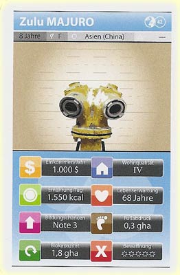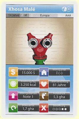 Hat man jedoch andere Prioritäten und hält Ausschau nach etwas sehr Lehrreichem, ist man hier an der richtigen Stelle. Denn das Globospiel weckt bei den Kindern auf interessante Weise eine gewisse Sensibilität für die oft schwierigen Lebenslagen der Menschen überall in der Welt. Alle meine Testkinder ab 9 Jahren fanden das Spiel jedenfalls interessant und waren immer wieder gerne bereit, eine Partie mitzuspielen. Gelernt haben sie dabei sicherlich einiges und vieles wurde ihnen bewusst, wovon sie vorher keine Ahnung hatten: Dass in Afrika die Lebenserwartung von Kindern sehr gering ist, wie viele Menschen mehr in Asien leben als in Europa oder Amerika, wie reich die Nordamerikaner im Vergleich zu Menschen aus Asien und Afrika sind und dass die Kinder in den armen Ländern nicht in die Schule gehen dürfen, um nur einige Vergleichskriterien zu nennen. Weiters werden die Bewohner von Globo nach folgenden Kriterien charakterisiert: Alter, Geschlecht, Kreditrating, Einkommen, Wohnqualität, Ernährung, Bewaffnung, Biokapazität und ökologischer Fußabdruck.