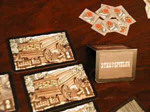 Die Karten, im Westernstyle gehalten, sind optisch ansprechend, allerdings aus spielerischem Gesichtspunkt nicht unbedingt ideal. So kann es bei den Warenarten Holz und Stein schon einmal zu Verwechslungen kommen, wenn man etwas unaufmerksam ist.