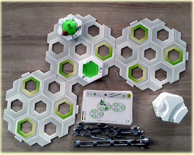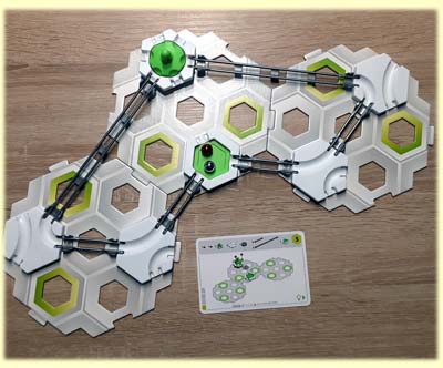 Dazu werden zunächst die Grundplatten gemäß der Abbildung auf der ausgewählten Karte zusammengesteckt und Start-Splitter und Zielplättchen auf den entsprechenden Feldern platziert. Als nächstes werden alle Teile, die oben auf der Karte abgebildet sind, in der entsprechenden Anzahl bereitgelegt. Anschließend beginnt das Austüfteln der richtigen Strecke.