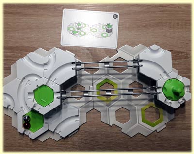 Karte „1“ selbst beginnt relativ überschaubar mit nur einer Grundplatte und zwei Kurven-Steinen, benötigt somit keine Schienen und der Weg zum Ziel ist mit nur zwei zu legenden Teilen ziemlich einfach herauszufinden. Auch „2“ kommt noch ohne Schienenstrecken aus, die erst bei „3“ hinzukommen. Bis einschließlich Karte „7“ sind dann alle Elemente eingeführt, sodass ab „8“ auch das Schwierigkeitsniveau steigt, was an der gelben Markierung unten am Rand zu erkennen ist.