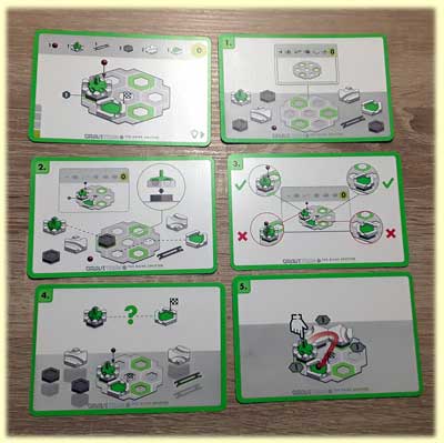 Für alle, die mit dem Gravitrax-System noch nicht vertraut sind, gibt es eine Karte „Null“, auf der neben der Aufgabe in einer fünfteiligen Schritt-für-Schritt-Anleitung erklärt wird, wie die Strecke zum Ziel genau zu legen ist. Somit können auch Einsteiger das Prinzip der Höhen-Steine, des Spinners und der Geraden und Kurven kennenlernen und einer eigenen Lösung bei Karte „1“ steht nichts im Wege.