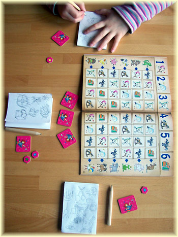 Schön finde ich, dass sich das Zauberbuch im hinteren Teil verändert. Hier werden nicht mehr Bilder gezeigt, sondern nur Wortbeschreibungen gegeben, so dass die Kinder nicht einfach das jeweilige Motiv abmalen können, sondern selbst kreativ werden müssen. Das macht die Angelegenheit auch nach mehrmaligem Spielen wieder interessant.