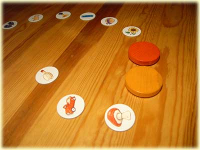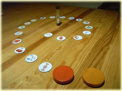 Die 21 Gegenstandsplättchen werden in einer beliebigen Reihenfolge aufgelegt und die Sanduhr bereit gestellt. Wer an der Reihe ist, schaut sich die ersten beiden Plättchen genau an und deckt diese dann mit zwei Holzscheiben zu. Sobald die Sanduhr umgedreht wurde, beginnt die Runde.