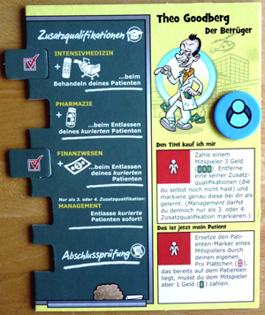 Jedem Spieler stehen pro Runde zwei Spielfiguren und eine große Auswahl an Aktionsfeldern zur Verfügung. So kann man Medikamente besorgen, durch Nachtschichten Geld verdienen, sich fortbilden, eine Abschlussprüfung ablegen und - wie schon erwähnt - krumme Dinger drehen. Aber in erster Linie geht es natürlich darum, Patienten zu therapieren. Deren erfolgreiche Heilung erfordert die Gabe unterschiedlicher Medikation, was mit entsprechend unterschiedlichen Siegpunkten belohnt wird. Bis dahin ist der Weg oft gar nicht so lange, denn zumindest jener Patient, der im Bett ganz rechts liegt, verlässt am Ende der Runde das Krankenhaus, ob geheilt oder nicht. In letzterem Fall sehr zum Leidwesen seines behandelnden Arztes, denn dann war die Gabe der bisherigen Medikation umsonst und man zieht ohne Belohnung von dannen. Man sollte sich also sehr gut überlegen, auf welchen Patienten man setzt, zumal man an keinem Patienten herumdoktern darf, der schon von einem anderen Arzt behandelt wird.