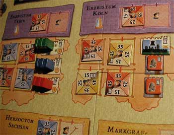 Etwas problematisch gestaltet sich die Kaiserwahl, die praktisch in jeder Runde stattfindet - meist wird die Aktion "Gegenkaiser" vom ersten Spieler genommen, der die Durchführung seiner Aktionen beendet. Da bei drei Spielern dann nur ein Spieler vor der Entscheidung steht, wen er unterstützen soll (und damit auf jeden Fall einen Siegpunkt für die Unterstützung erhält), und bei zwei Spielern dieses Element völlig wegfällt, ist die Kaiserwahl nur in der vollen Besetzung mit vier Spielern richtig spannend.