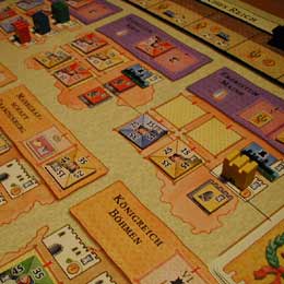 Aufmachung Spielbarkeit Interaktion Einfluss Spielreiz 13.04.11 von Frank A. - Ich finde die Grafik des Spiels und des Titels absolut passend für ein Mittelalterspiel. Das Spiel selbst ist ein absoluter Leckerbissen. Sehr hohe Spieltiefe und trotzdem ziemlich locker und zügig zu spielen, wenn man erst mal die verschiedenen Karten verinnerlicht hat. Wobei es weniger unterschiedliche Karten gibt als z.B. bei Puerto Rico, d.h. nach 2 Partien sollte alles klar sein. Zu Zweit nicht zu empfehlen.