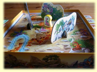 Das Tal der Drachen wird im Schachtelboden aufgebaut – dazu steckt man drei Bäume in den Spielplan. Etwa 40 cm davon entfernt wird der Magierturm aufgestellt, davor ein Weg, an dessen Beginn die Magierfigur platziert wird. Die Drachenfiguren verschwinden im Stoffsäckchen, und abhängig von der Spielerzahl erhält jeder Spieler drei bis sechs Drachenkarten in unterschiedlichen Farben.