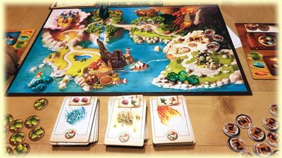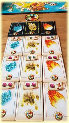 Zauberschule Isidore: Je 2 Zutaten darf man hier in je einen von drei Zaubersprüchen (Feuer, Stein, Wasser) umtauschen, jedes Element darf man aber nur 1x besitzen