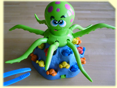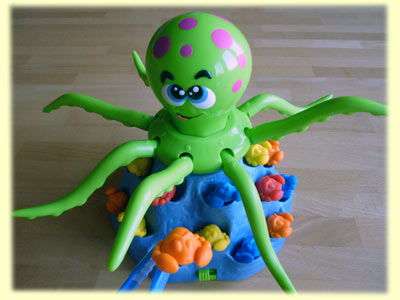 Mit Fingerspitzengefühl versuchen die Spieler, die kleinen Krebse unter den Fangarmen von Jolly Octopus herauszuholen. Doch das ist nicht so einfach, denn diese sind ständig in Bewegung. Und wenn man seine Arme berührt, fängt er zu kichern an, denn er ist furchtbar kitzelig.