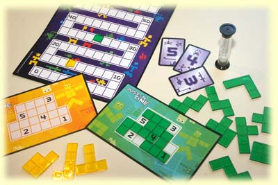 Noch ein paar Worte zur Qualität des Spielmaterials. An der Sanduhr, den Aufgabenkarten und den Spielsteinen gibt es nichts zu meckern. Die Tafeln jedoch sind recht dünn ausgefallen. Bei den Legetafeln fällt dies - im wahrsten Sinne des Wortes - nicht so ins Gewicht, wenn auch etwa Ubongo deutlich stärkere Tafeln verwendet. Aber auch die Punktetafel ist mit schätzungsweise nur 320 g/m² Papierstärke alles andere als stabil, weshalb es hier von mir schon Punkteabzüge und eine kleine Rüge an die Chefredaktion gibt.