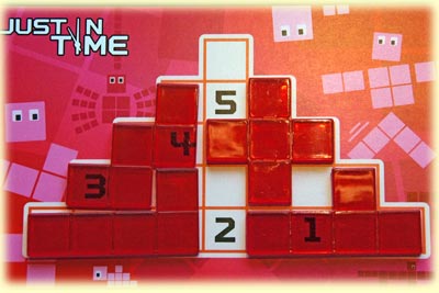 Grafisch ist Just in Time an die Knizia-Spiele Fits und Bits angelehnt, was von Ravensburger marketingtechnisch logisch und nachvollziehbar scheint, da beides erfolgreiche Spiele sind. Vom Spielprinzip ähnelt es aber eher Ubongo, denn auch hier müssen Puzzleteile unter Zeitdruck passend eingebaut werden. Die Punktevergabe durch die freigebliebenen Zahlenfelder machen es aber zu einem völlig eigenständigen Spiel.