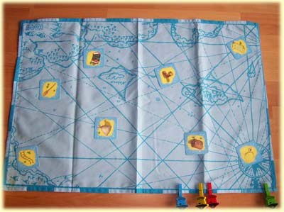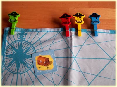 Beim Auspacken der Schachtel, die sich für eine meistens mit viel Holz gefüllte Haba-Box sehr leicht anfühlt, waren bis jetzt alle, die mitgespielt haben, entzückt. Die Seekarte aus Stoff, an deren Rand mit Wäscheklammern, die einen Piratenkopf tragen, die Punkte festgehalten werden, macht schon einiges her. Unterstützt wird die Piratenatmosphäre natürlich auch durch die Augenklappen und die einfachen, aber dennoch wirkungsvollen Papp-Fernrohre. Das Material ist also wirklich vom Feinsten.