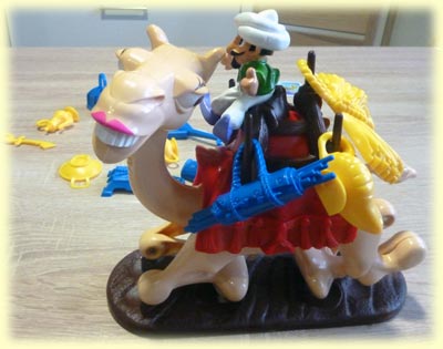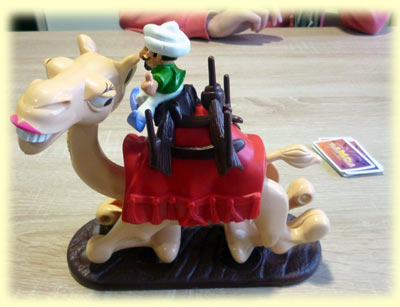 Ich weiß nicht, ob es ein Konstruktionsfehler meines Kamels ist oder ob das auf alle Kamelas zutrifft: Das Setzen des Kamels verursacht trotz genauer Beschreibung in der Spielanleitung massive Probleme. Gemäß Spielregel sollte sich das Kamel von selbst setzen, wenn man Hals und Schwanz zusammendrückt. Vor allem bei den ersten Versuchen funktioniert das nicht auf Anhieb, denn man hat dabei immer das Gefühl, dass der Schwanz gleich abbrechen könnte. Ich weiß nicht, wie lange diese Mechanik funktionstüchtig bleiben würde, wenn man die Spielvorbereitungen ständig in unbeaufsichtigte Kinderhände geben würde. Bei meinem Kamel ist es außerdem so, dass das Einrasten nicht richtig klappt. So springt das Kamel manchmal schon auf, wenn man nur Ali Baba darauf platziert, was völliger Quatsch ist, denn man möchte ja wenigstens einige Gepäckstücke an den Sattel hängen.