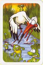Kecke Frösche treiben ihren Schabernack: Am Ufer, auf dem Teich und unter Wasser. Da kann auch der Storch nur kurzzeitig stören. Ziel ist es, am Ende die wenigsten Frösche und Störche vor sich liegen zu haben und Gewinn daraus zu ziehen, dass die Mitspieler noch möglichst viele Karten besitzen.