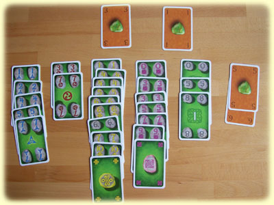 Auf dem Tisch werden die orangefarbenen Wunschsteinkarten mit den Werten 1 bis 9 in einer Reihe ausgelegt. Alle übrigen Karten, die es in jeweils fünf Farben gibt, werden gemischt und acht davon an jeden Spieler verteilt. Dann kann's auch schon losgehen. Prinzipiell spielt man, wenn man an der Reihe ist, ein bis zwei Karten aus und füllt seine Kartenhand wieder auf. Beim Ablegen gibt es folgende Möglichkeiten: