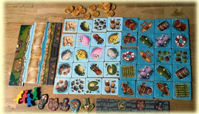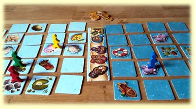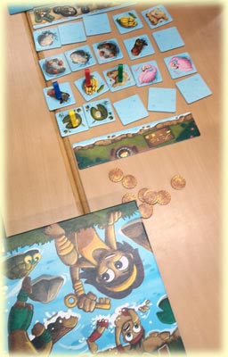 Der Spielablauf ist dann eigentlich ganz einfach, denn man hat immer zwei Aktionen. Als Erstes darf man einen Schritt vorwärts oder seitwärts springen (im ersten Zug mangels „Landeplatz“ nicht möglich) und danach muss man zwei Flussplättchen aufdecken. Entdeckt man dabei ein Pärchen, darf man als Belohnung einen Schritt springen oder einen Talisman nehmen und die Plättchen bleiben offen - diese zeigen verschiedene Gegenstände/Tiere, über die man dann springend den Fluss überqueren kann. Der Talisman kann entweder später als Extrasprung benutzt werden oder erlaubt bei Schlüsselbesitz das Ansehen eines Tempelplättchens.