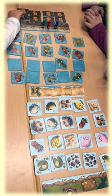 Für 5-Jährige, die bisher noch nicht so viel Spielerfahrung haben, ist Kokonana! auf jeden Fall eine Überforderung, wenn die Kinder auch selbstständig spielen sollen. Selbst mit der vorgeschlagenen Variante für jüngere Kinder (die 3 Wandplättchen nicht zu benutzen und Talismane nur für Zusatzschritte zu nutzen) ist eine durchgängige „Spielbegleitung“ sinnvoll.