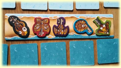 Hat man kein passendes Paar gefunden, soll man laut KOKONANA! rufen (so schimpfen die Läufer der Kona bei Missgeschicken) und die Plättchen wieder verdecken. Beim Erreichen der Sandbank darf man sich einen farbigen Schlüssel aussuchen.