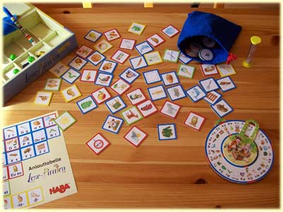 Das gesamte Material wurde sehr professionell gestaltet, denn die diversen Bild- bzw. Buchstabenkarten sind farblich sortiert, so dass man erstens für Anfänger schwierige Dinge wie Umlaute oder Buchstabenfolgen sowie Inlaute leicht aussortieren, und zweitens den Kindern durch die farblichen Unterschiede der einzelnen Laute immer wieder optisch vor Augen führen kann, zu welcher Gruppe ein Buchstabe denn nun gehört. Außerdem zeigen die Lautkarten auf der Vorder- und Rückseite jeweils den zum Großbuchstaben gehörigen Kleinbuchstaben.
