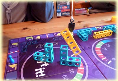 Wer an der Reihe ist, nimmt sich die oberste Baukarte vom verdeckten Stapel. Entsprechend den dortigen Angaben wird der Timer auf 40 Sekunden, 1 oder 2 Minuten gestellt. Danach darf der Spieler versuchen, die dort abgebildete Konstruktion nachzubauen. Dafür muss er den Kran benutzen. Ob er diesen allerdings mit der Hand bedienen darf oder ihn sich an den Kopf binden muss, bestimmt die aktuelle Position seiner Spielfigur. Ist die Zeit abgelaufen, gibt es Punkte für jedes Bauteil, das richtig liegt. Hat man alles korrekt geschafft, erhält man außerdem noch vier Bonuspunkte.