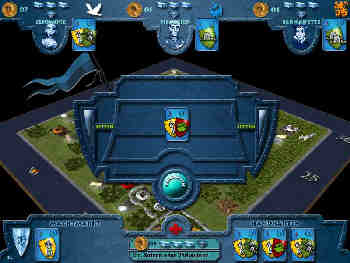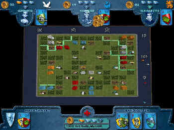 Präsentation und Steuerung: Haben wir uns vor Spielstart für die Zahl der Computergegner (1-3) und deren Schwierigkeitsgrad (einfach, mittel, schwer) entschieden, startet das Spiel mit der Setzphase der Burgen. Der Blick auf das Spielfeld offenbart zunächst ein gelungenes Maß an Übersicht: Die Computergegner sind am oberen Bildrand aufgereiht, Geldvorrat, Minenbonus und abgelegte Karten werden angegeben. Die Aktionen der einzelnen Spieler werden durch einen übersichtlichen Lauftext angezeigt. Die Karten des menschlichen Spielers sind am rechten unteren Bildrand aufgereiht, der linken untere Bildrand ist für Machtkartenmarkt und Nachziehstapel reserviert. Hierbei offenbart sich ein erster Mangel: Auf der angezeigten Fläche des Machtkartenmarktes finden nur 3 abgelegte Karten Platz. Werden es mehr, muss nach links und rechts gescrollt werden. Das stört insbesondere dann, wenn die Computergegner Machtkarten aus dem nicht sichtbaren Bereich des Marktes aufnehmen, da dies kaum nachzuverfolgen ist.