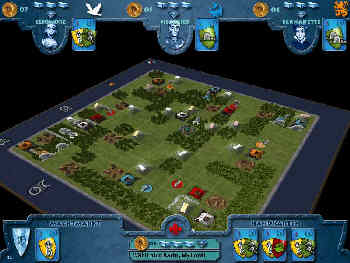 Künstliche Intelligenz und Spielreiz: Einer der wichtigsten Punkte bei PC-Umsetzungen ist die Stärke der Computergegner, schließlich sollen diese das Fehlen menschlicher Mitspieler kompensieren. Die PC-Gegner in Löwenherz agieren auf der positiven Seite sehr zügig, je nach eigener Spielweise dauert eine Parte rund 15-20 Minuten. Bei meinen ersten beiden Testpartien gegen 3 Computergegner im Modus „Schwer“ wurde ich einmal letzter, und einmal klarerer Sieger. Wie kam es dazu? Es fällt auf, dass beim Einsetzen der Burgen stets zwei Computergegner ausschließlich damit beschäftigt sind, den menschlichen Spieler sofort „einzuquetschen“. Da werden wesentlich lukrativere Setzpositionen außer Acht gelassen, um sich sofort an zwei Seiten direkt neben die menschliche Burg zu zwängen, um von Anfang an nur ein Minimalmaß an Entfaltungsmöglichkeiten zu ermöglichen. Nun habe ich nichts gegen aggressives Spiel und Herausforderungen, nur wird im Laufe einiger Testpartien klar, dass dieses extrem destruktive Setzverhalten offensichtlich die Spielschwäche der PC-Gegner im weiteren Spielverlauf vertuschen soll. Gelingt es einem Spieler einigermaßen frühzeitig , sich aus der Umklammerung der PC-Gegner zu befreien, ist das Spiel schon fast gewonnen. Denn die künstliche Intelligenz produziert jetzt eine ganze Reihe absurder Züge: Da werden Minigebiete von 2 Feldern Größe mit Bündniszwängen gesichert, oder Gebiete, die aufgrund mehrseitiger Bündnisse gar nicht mehr ausbaufähig sind, mit Rittern vollgestopft. Gerne werden Ritter auch blindlings neben Burgen gesetzt, die nie und nimmer noch mit Mauern umschlossen werden. Setzt ein Spieler 1-2 Ritter ein und droht mit Expansionen in Feindgebiete, schützt der PC sich sofort panisch mit Bündnissen, wenn er eine entsprechende Karte besitzt. Die taktisch oft klügere Gegenaggression durch eigene Ritter wird nur selten als Behelfslösung genutzt. Solch unsinnige Züge werden meist durch Verkauf der wichtigen Expansionskarten finanziert – und wenn diese denn tatsächlich auch auf dem Markt erscheinen, nimmt man derartige Geschenke als Spieler natürlich gerne an. Da der PC sich zudem bei Expansionen darauf beschränkt, stets die punktemäßig lukrativsten Felder zu übernehmen, anstatt gezielt führenden Gegenspielern zu schaden, kann man sich oft ungestört bis zur 30-Punkte-Siegbedingung hinexpandieren. Erreiche ich diese, endet das Spiel erst, sobald ich meine Handkarten wieder auf 3 ergänzt habe – auch so eine Kuriosität für sich.
